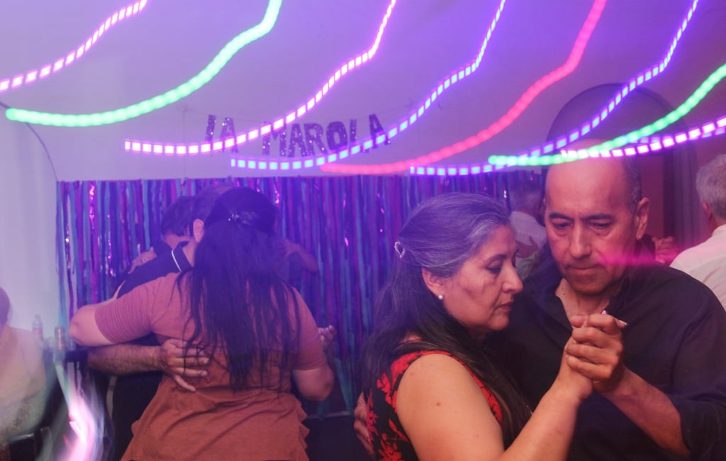 En Traslasierra también se lo encuentra, se toca, se canta y se baila tango. Existe un circuito de milongas por toda la ruta 14 desde Mina Clavero a Merlo con distintos profesores que enseñan esta danza en distintos puntos del valle. La Milonga, lugar donde se me fue metiendo el tango en el corazón, es ese espacio/tiempo donde suena (tango) durante horas y la gente se encuentra para bailar, mejor dicho para abrazarse y bailar. Ahí convergen las distintas generaciones y personas de todo tipo y clase social. Y se genera comunidad. Cómo en la vida misma hay abrazos más cómodos que otros, hay tantos abrazos y formas como personas. Lo lindo y atractivo para mí es esta disposición al encuentro, al abrazo, a una escucha atenta, para moverse y desplazarse con un otro muchas veces desconocido para bailar tango. Su musicalidad sirve a ese juego lleno de posibilidades. Las parejas bailan en sentido antihorario para darle orden a la cosa y no chocarse aunque también hay que estar atentx a la ubicación de las otras parejas y de la propia. Se baila una tanda de 3 o 4 tangos, vals o milongas juntitos y luego, con una cortina musical de un tema de cualquier otro género musical se vacía la pista, se disuelven las parejas y se vuelve a comenzar, a dar la chance de salir a bailar otra vez pero con alguien más. Las chicas hoy también sacamos a bailar, aunque “tradicionalmente” los hombres eran los que cabeceaban a la mujer invitándola a danzar. Hoy se baila entre todxs, no importa el género, se baila entre mujeres y entre hombres también. Originariamente se bailaba entre hombres. Está ese tango viejo conviviendo con el tango nuevo. Hoy el tango se fusiona con otros géneros musicales. Y hay todo un espectro de nuevas orquestas y grupos haciendo composiciones propias y letras que hablan de temas, historias y sentires actuales.